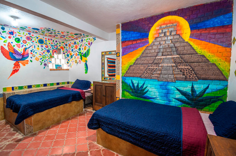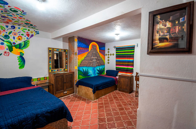 Espaciosa habitación que cuenta con dos camas individuales y baño privado, tiene un amplio ropero y está decorada con murales alusivos a la Pirámide del Sol, que es la construcción más importante del conjunto arqueológico de Teotihuacan. Esta habitación tiene ventanas al interior.
