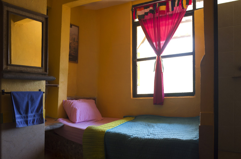 Pequeña habitación individual con baño privado y una ventana con vista a la ciudad, cuenta con un amplio locker y está ubicada en la segunda planta del hostal.